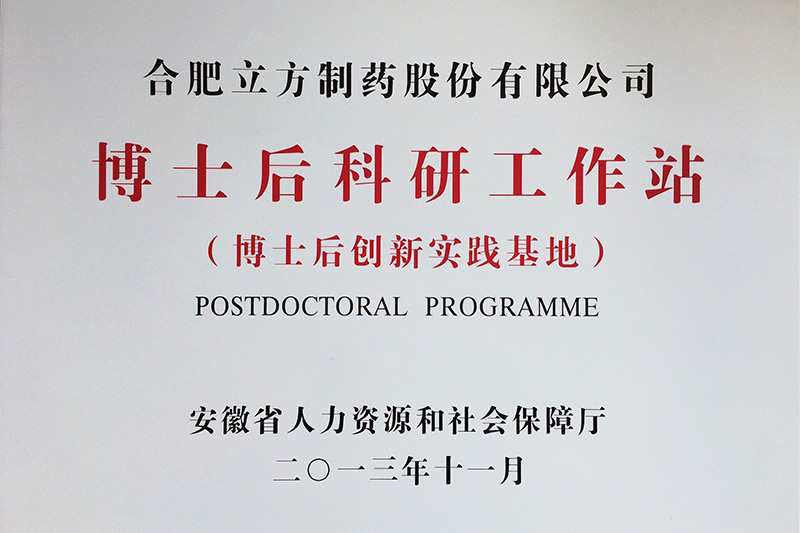 立方制藥 安徽省博士后科研工作站 銅牌